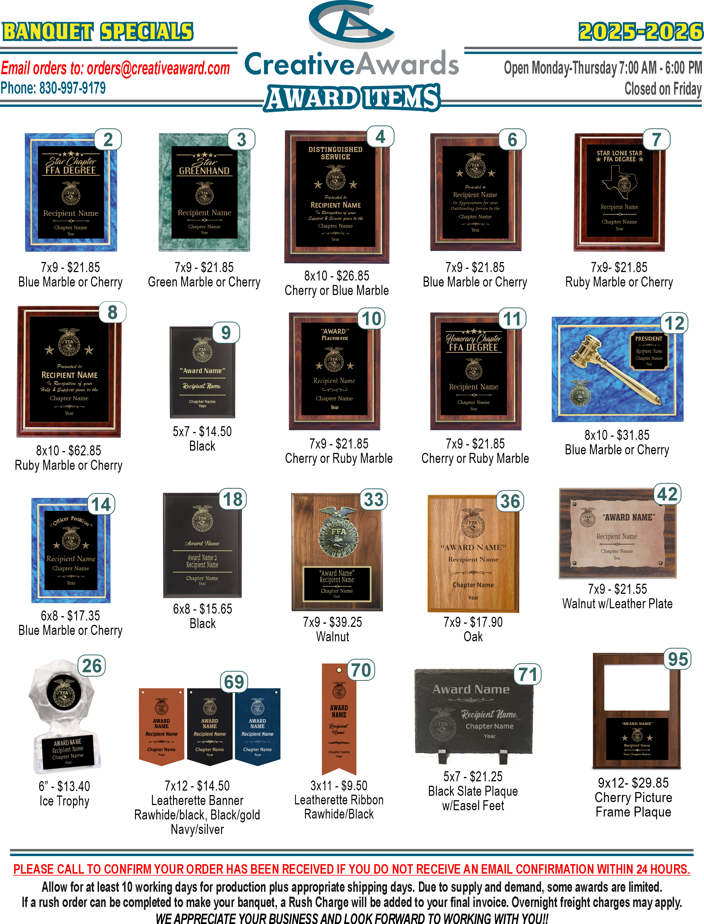 Creative Awards, based in Fredericksburg, Texas has over 30 years of experience creating outstanding awards for your FFA Chapter.